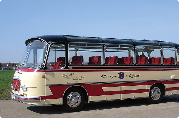 Unser „Oldi“ ist ein echtes Schätzchen: Baujahr 1965 mit Panoramaverglasung und Orginalausstattung. Er behält natürlich sein historisches Aussehen und wird nach wie vor das Ellwanger Stadtwappen tragen. Gerne wird er für Hochzeiten, Geburtstage und besondere Ausflüge gebucht.
